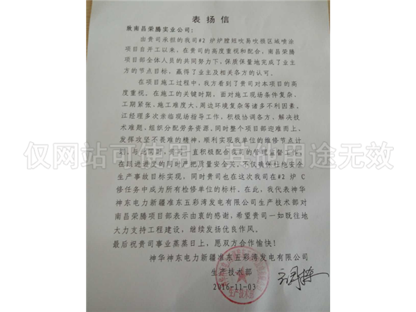 新疆昌吉電廠表揚(yáng)信